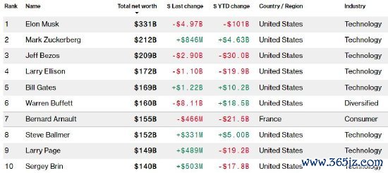 特斯拉CEO埃隆·马斯克仍然稳居首富,净资产为3310亿美元,今年缩水了1010亿美元。